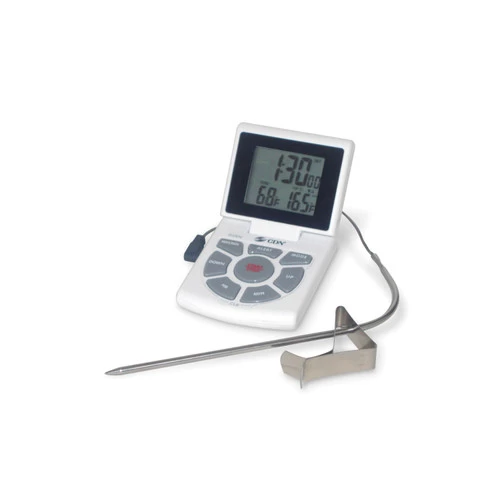 The most functional, accurate and reliable device, the CDN Digital Thermometer and Clock will monitor the temperature in the oven while you are busy preparing your favourite dishes. Featuring an updated design and easy-to-read buttons, it includes a higher heat probe cord that gives it maximum versatility and ease-of-use in the kitchen and at the grill. Perfect for roasting or grilling, simply insert the probe into the food, place the food in the oven or barbecue and close the oven door (or grill cover) directly over the sensor cable. Set the temperature alert for USDA safe cooking temperatures — listed on the back of the case! Both the set and actual temperatures are displayed during cooking. For oven testing, the DTTC samples the variance of internal temperatures and displays the maximum and minimum temperatures reached. It’s also great for alerting properly chilled temperatures.