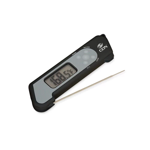 The CDN Folding Digital Thermocouple Thermometer features a highly-durable design that is water-resistant, shatterproof, and is manufactured with BioCote, an antimicrobial agent. Perfect for thin cuts of meat, fish or poultry, simply flip down the rapid-response thermocouple probe and insert it into food as thin as 1/8-inch. The display features extra large digits and can be backlit for low-light conditions. BioCote technology gives the water-resistant housing constant, built-in antimicrobial protection, providing a finish that helps prevent microbes from growing on the surface. It offers Minimum and Maximum modes. Minimum mode displays the lowest temperature among multiple readings. Maximum mode displays the highest temperature among multiple readings.