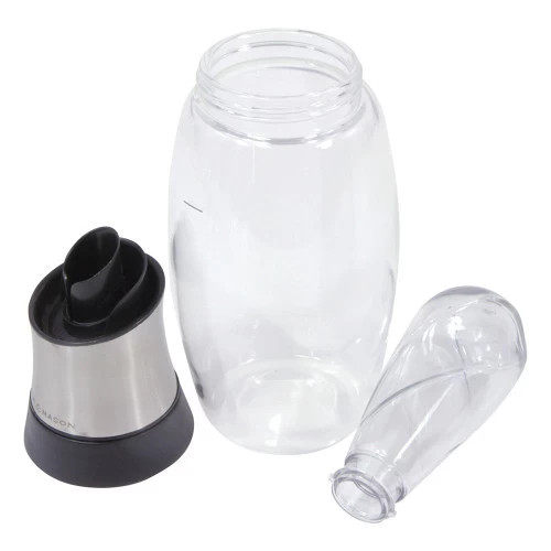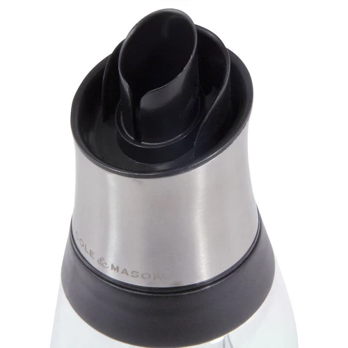 Fashionable form and function unite in this oil and vinegar dispenser from Cole & Mason. This duo pourer features separate spouts to keep the oil and vinegar from mixing and the stainless steel lid rotates to switch easily between the two and lock it closed. The drip return system no mess and no cross contamination and a wide neck and removable well design simplifies refilling and makes for easy cleaning. With a 1.5 fluid oz. of vinegar and 14 fluid oz. oil capacity, you can use this dispenser for a wide range of oils, vinegars, and other pourable sauces. Made with durable borosilicate glass, this dispenser is also dishwasher safe.Â
