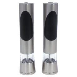 The Cole & Mason 8.5 in. Richmond Electronic Salt and Pepper Mill Set excels in offering a signature statement for any kitchen. This electronic salt & pepper mill gift set uses premium hardened steel to slice and grind, ensuring perfect flavor every time and at any setting. The use of a durable grinding mechanism guarantees a prolonged lifespan and even better results. This remains true even when used with large grained peppers or hard artisanal sea salts. The single touch of a button is all it takes to operate both grinders. From fine and powdery to coarse, this salt & pepper mill gift set is adjustable for the perfect grain. The Cole & Mason Richmond Electronic Salt and Pepper Mill is powered by six (6) AAA batteries.