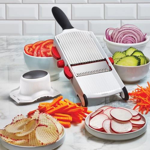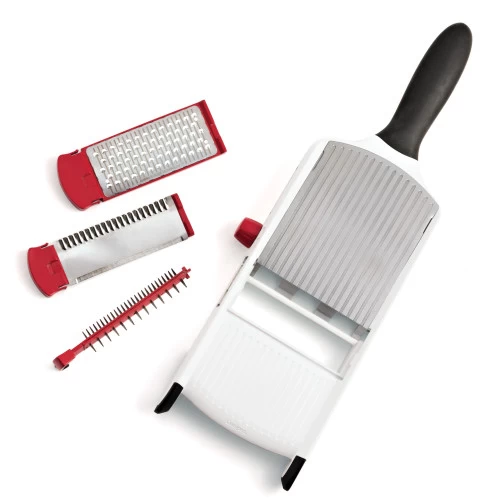 The handheld winner of Excellence in Housewares, this Cuisipro Mandoline featuring Surface Glide Technology comes with all the features of a full-sized mandoline in one compact body. Comes with six adjustable thickness settings, three interchangeable blades for slicing, crinkle & waffle cutting, dicing and julienning. Makes perfectly sliced potato chips in the blink of an eye.