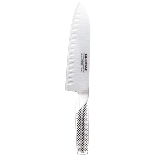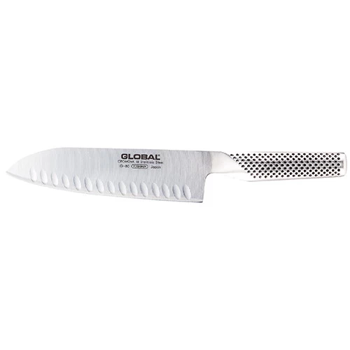 The Global G80 7″ Santoku Hollow Ground Edge Knife (71G80) is made from the finest Cromova 18 stainless steel that is ice tempered and hardened to Rockwell C56-58. This allows the blade to remain razor sharp more than any other steel. It also resists rust, stains and corrosion. The knife is carefully weighted to ensure a perfect balance in the hand. The hygienically safe-smooth contours and seamless construction eliminates food and dirt traps.