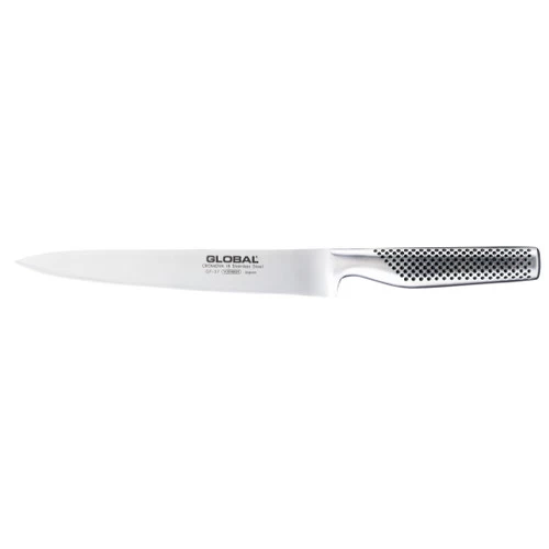 The Global GF37 Carving Knife is a drop-forged carving knife is used to slice thin cuts of meat such as poultry, roasts, hams and other large cooked meats. The blade is thinner than a chef’s knife for more precise slices of meat.