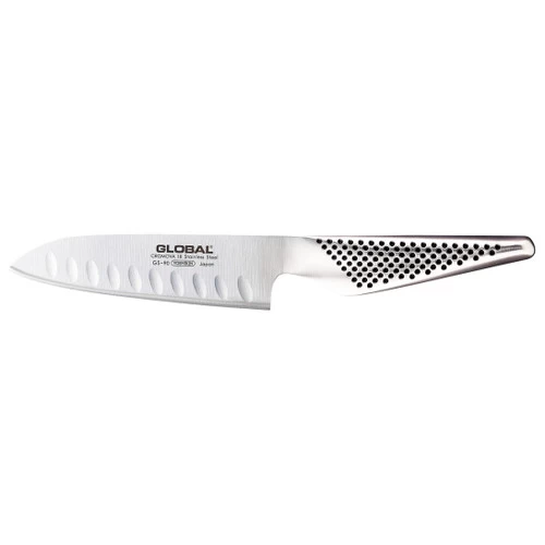 The Global GS90 5″ Fluted Santoku is an alternative to the chef’s knife. Great for cutting, chopping and mincing vegetables. The blade has a straighter edge than a chef’s knife, a hollow ground edge for better food release, and a blunted sheepsfoot-tip blade with a thinner spine. It can easily slice thin-boned and boneless meats, fish and vegetables.