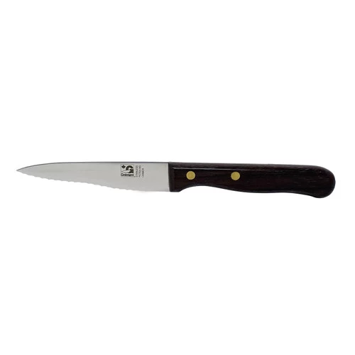 The 3″ serrated blade ideal for fruit, veggies, etc. Steel is partial tang, meaning it goes partway through the handle and is durably riveted, making it a more lightweight choice.Â