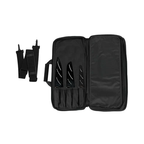 The Kai 20-Slot Knife Case is the safe, secure way to travel with knives. Rigid supports inside the case resist crushing and protect your knives in 20 elasticized pockets. Three zippered net pockets are ideal for non-bladed kitchen tools. The PVC-laminated 600 denier woven polyester case includes heavy-duty nylon straps and an exterior business card carrier. It is fully zippered, has Velcro closures, and offers a padded, reinforced handle when it’s time to travel.