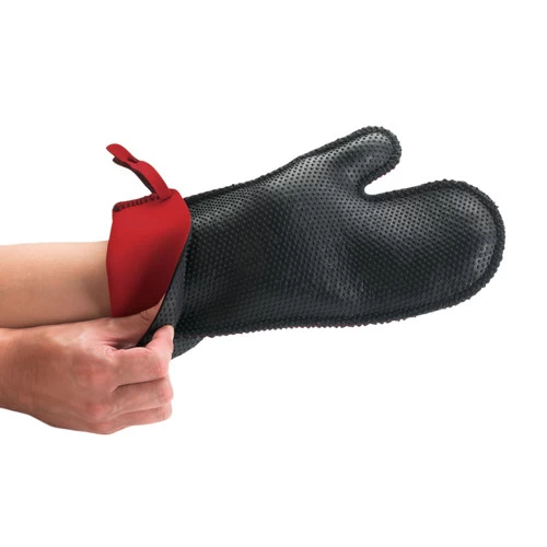 Protect your hands from both hot and cold temperatures in the kitchen with a small Kitchen Grips Chef’s Mitt. This unique kitchen mitt is made of an innovative material called FLXaPrene. This material is not only heat-resistant (500°F/260°C to -134°F/-92°C) but also stain resistant, water-repelling, and have a non-slip grip. Easy to clean, FLXaPrene prevents stains that cause bacterial buildup, making the mitt more hygienic. Flexible and comfortable, the raised nub surface is engineered to provide a better and safer grip. This mitt is dishwasher safe in the top shelf.