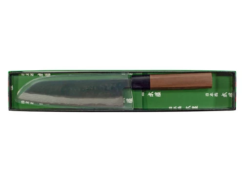 This beautiful knife was handcrafted by Toshiki Nanbu in Takefu, Japan, using the traditional techniques of an Echizen blacksmith. Forged from V2 steel, the high-carbon steel core is surrounded by 10 layers of Damascus-cladding to give the knife the intricate patterning near the edge. The dark kurouchi finish of the blade is created during the heat-treating process. This coating or patina protects the blade from rust and gives the blade a rustic, authentic styling. Each Nanbu knife is finished with a traditional octagonal handle of pakkawood and walnut.