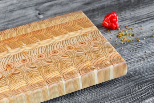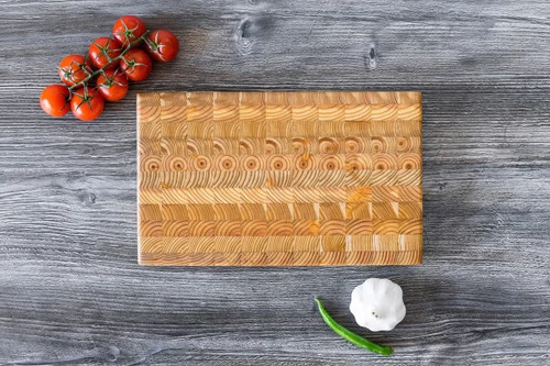 This wooden cutting board has a compact, space-saving design that fits in any kitchen, but still offers enough cutting space to meet the daily demands of most households. The flawlessly smooth surface is not only extremely impact-resistant and gentle on your knife’s blade, thanks to the end grain wooden blocks, but also offers incomparable haptics and an impressive appearance. The soft rubber feet ensure that the board always remains well ventilated, does not slip and is also much easier to pick up.