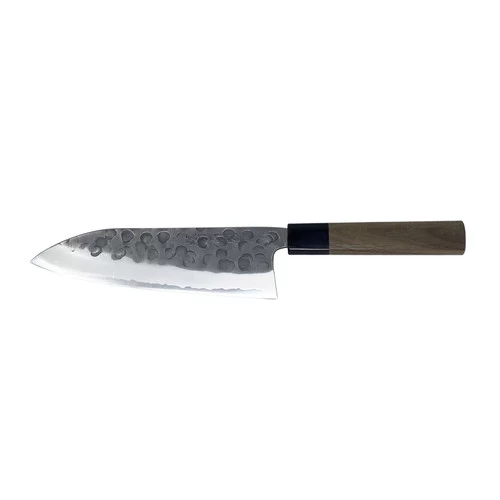 Completely handcrafted by 4th generation blacksmith Katsuto Tanaka, this knife is forged with a cutting core of Aogami #2 Carbon Steel that features a beautiful and rustic hammered Tsuchime stainless steel outer surface for a total of 3 layers. The blades are very thinly ground and deliver effortless cutting performance for both right and left-handed users. The octagonal handles are made with Rosewood and feature a black pakkawood ferrule.