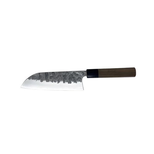 Completely handcrafted by 4th generation blacksmith Katsuto Tanaka, this knife is forged with a cutting core of Aogami #2 Carbon Steel that features a beautiful and rustic hammered Tsuchime stainless steel outer surface for a total of 3 layers. The blades are very thinly ground and deliver effortless cutting performance for both right and left-handed users. The octagonal handles are made with Rosewood and feature a black pakkawood ferrule.