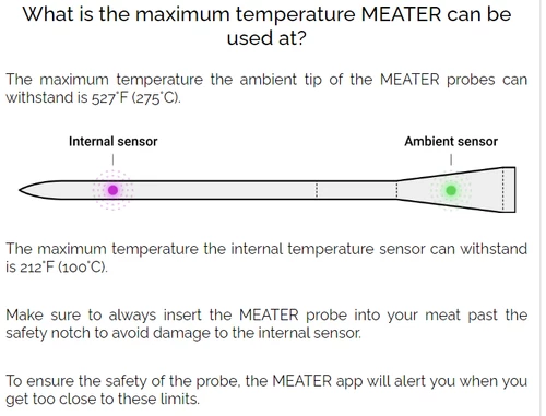 Note: The maximum temperature the ambient tip of the MEATER probes can withstand is 275°C. The maximum temperature the internal temperature sensor can withstand is 100°C. Make sure to insert the MEATER probe into the meat past the safety notch to avoid damage to the internail sensor. To ensure the safety of the probe, the MEATER app will alert when too close to these limits.Â