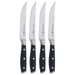 The Messermeister Avanta Black POM Steak Knife is high quality and affordable. These blades are crafted from high quality German steel, which gives you a knife that is sharp, rust resistant, and is easy to maintain. The bolster along with the full tang gives the knives great balance and heft. The 5” blade with a curved tip enables effortless slicing through steaks.