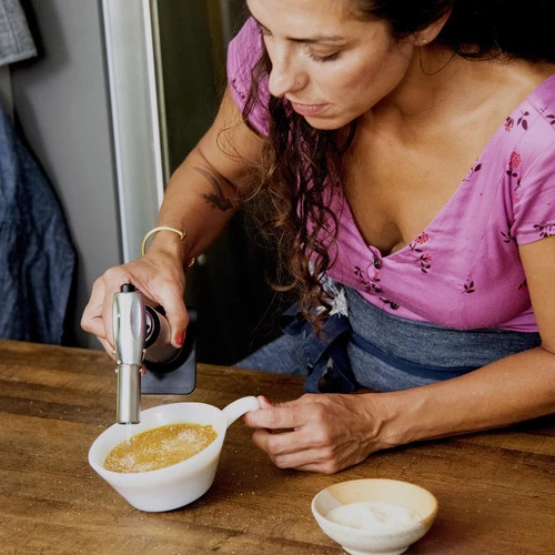 The Messermeister Cheflamme Culinary Torch is a trigger-start, aluminum torch for making that perfect crème brûlée. The temperature of the torch’s flame reaches up to 2000°F and it holds 200 minutes of use per 9 oz. of butane (not included).