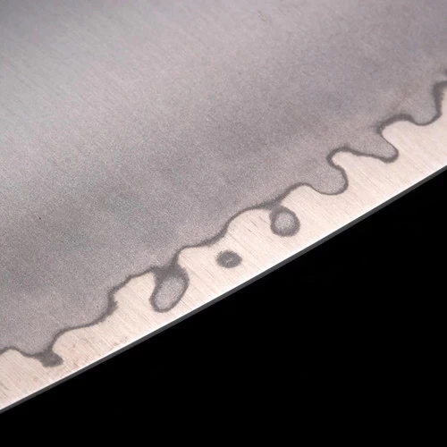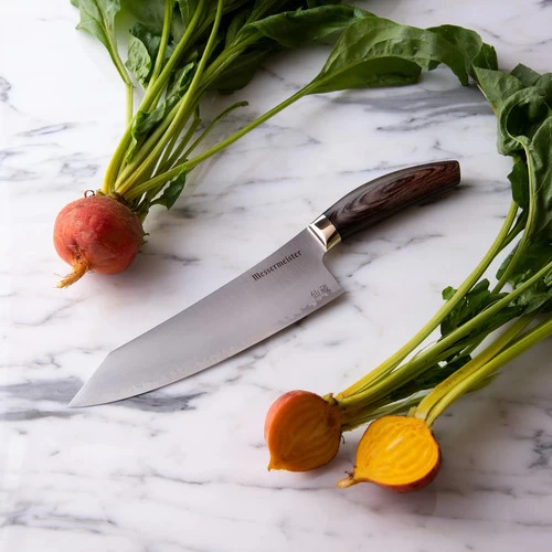 The innovative, modern, and stunning design of the Messermeister Kawashima Chef’s knife is characterized by its curved blade geometry, wide surface area and razor sharp 15 degree cutting edge made from rare SG2 powdered steel. The distinctive curved handle design ensures comfort while working by releasing arm tension and allowing smoother movements. The result is a well-balanced, highly maneuverable tool that feels perfect in the hand. Â