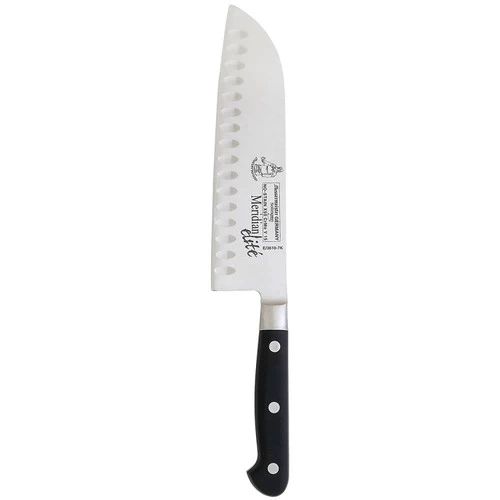 The Meridian Elite Kullenschliff Santoku Knife is a Japanese chef’s knife with the same versatility found in a traditional chef’s knife. It has a thin taper for maximum precision when slicing vegetables, fish and meat. The kullens (semi-circular hollows on either side of the blade) reduce drag and ease the cutting and separation of meats, cheese and vegetables. The blade and handle are compatible in width and weight, resulting in a well-balanced knife.Â