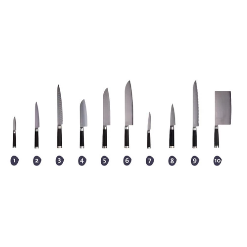 The most difficult part of the process is the assembly of the black pakkawood handle and the metal end piece, they are matched repeatedly until they fit together exactly. The water-resistant handle is designed in the distinct traditional Japanese chestnut shape so that it sits comfortably and naturally in hand. The metal end cap, as well as adding stunning sophistication, is functional. Etched with a number between 1 and 10 corresponding to the knife type, it allows for the quick identification of each knife so that you know its function with only a glance.