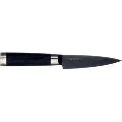 The most difficult part of the process is the assembly of the black pakkawood handle and the metal end piece, they are matched repeatedly until they fit together exactly. The water-resistant handle is designed in the distinct traditional Japanese chestnut shape so that it sits comfortably and naturally in hand. The metal end cap, as well as adding stunning sophistication, is functional. Etched with a number between 1 and 10 corresponding to the knife type, it allows for the quick identification of each knife so that you know its function with only a glance.