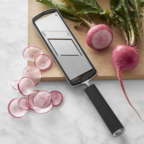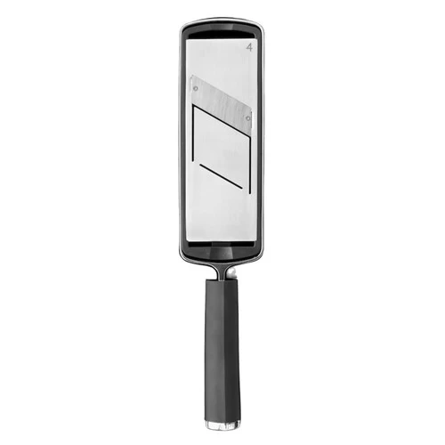 Precisely slice fine and delicate slices from fragile ingredients like truffles using the Michel Bras Micro Slicer. The VG-10 super-steel adjustable plate can slice from 0.33mm to 1mm thick without changing blades using a sliding lever to control the thickness. The ergonomic, ambidextrous handle is comfortable in hand and the wide stainless-steel frame permits smooth, flowing movement while slicing. A locking lever secures the slicing plate in place as well as enabling easy removal for cleaning.
