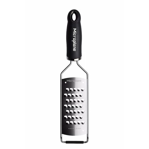 The Microplane Gourmet Extra Coarse Grater has an expansive paddle with ample grating surfaces and US made stainless steel blades. Ultra-sharp photo etched teeth make fast work out of grating potatoes, carrots, onions, and cheeses. The Stainless steel frame provides extraordinary durability. The soft touch handle matches back to the premium classic series zesters. The non-skid foot adds stability when grating on counters and plates.