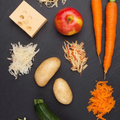 Apples, Cabbage, Carrots, Chocolate, Coconut, Hard and Soft Cheeses, Onions, and Zucchini. The results will be perfect for coleslaws or hashbrowns, as well as big shreds of soft cheeses like cheddar.