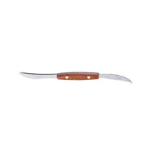 This squirtless grapefruit knife from Norpro has a stainless steel twin blades design that easily separate the membranes of the fruit. The dual sided curved blade frees sections from the rind. The rose wood handle sits comfortably in your hand.