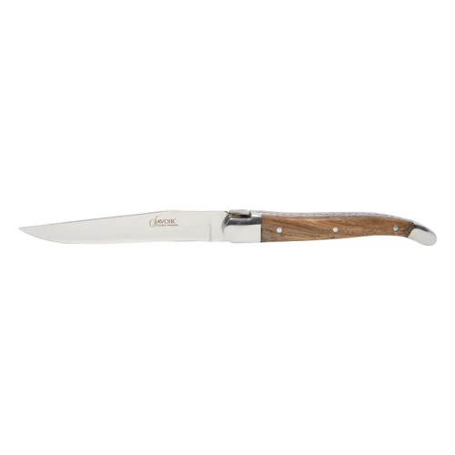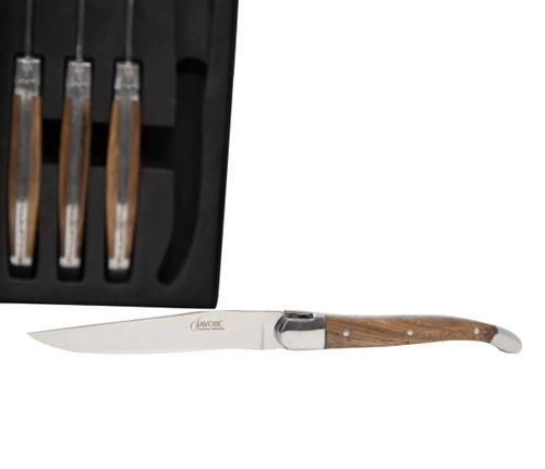 For a traditionally elegant steak experience, try the 4 piece Savoir Marseille Steak Knife set featuring straight edge blades and triple riveted zebra wood handles in the famour Laguiole style – named after a small French village. Since 1829, the Laguiole style of knife has been made world famous and recognized by the traditional bee blade catch, beautiful steel flourishes on the spine of the handle, and full tang construction. The Savoir Provence steak knives are beautifully crafted from a single bar of high carbon steel with front and rear bolsters. The German non-stain steel offers excellent edge retention and the fine edge is superior for slicing over serrated blades as it keeps the flavourful juices inside the meat.Â