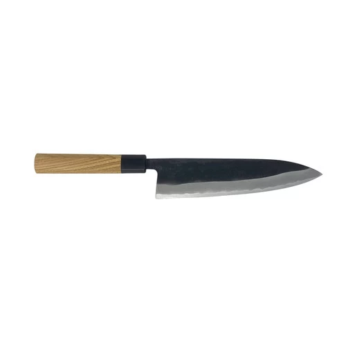 The Shiro Kamo Keyaki Gyuto 210mm  is a Japanese all-purpose chef’s knife. Similar to a Western chef’s knife, a gyuto has a thinner blade which holds a sharper edge. Suitable for all types of veggies, meats, and fish, a gyuto is best utilized with a downward slice, versus any chopping or aggressive cuts. Lightweight and extremely sharp, it is versatile, comfortable, and a pleasure to use.