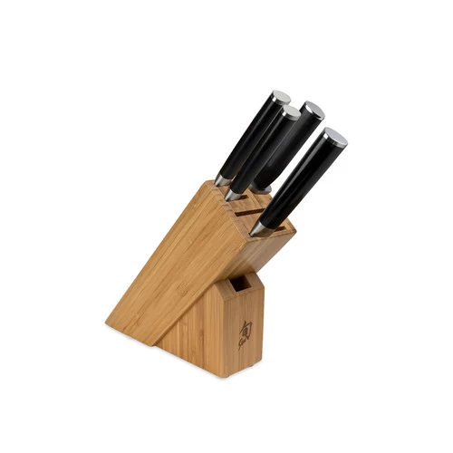 The Shun Classic 5-Piece Starter Block set includes three of the most essential Shun knives, plus the Shun Classic Combination Honing Steel and a beautiful 6-slot Slimline Block. You get the 8-in. Chef’s Knife, the 3.5-in. Paring Knife, and the 6-in. Utility Knife. Regular honing with the included Shun Combination Honing Steel helps maintain your edge and prolongs the time between sharpenings. The Slimline Bamboo Block takes up less space on your countertop and offers easy-care performance. Even with all this, you have room to add another knife and a pair of kitchen shears to your collection.