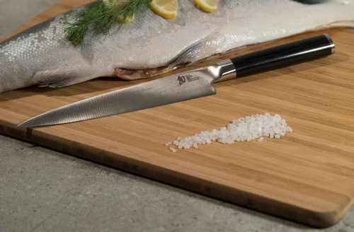 Just the right amount of flex in your blade steel makes filleting fish easier. The Shun Classic Flexible Fillet knife conforms to the ribs of the fish, removing meat from bones quickly and easily. Removing skin from meat is easier, too. It works well for boning and trimming out poultry and other meat as well. The whole idea is more food with less waste. Shun Classic’s D-shaped handle offers a comfortable grip and long-lasting beauty.
