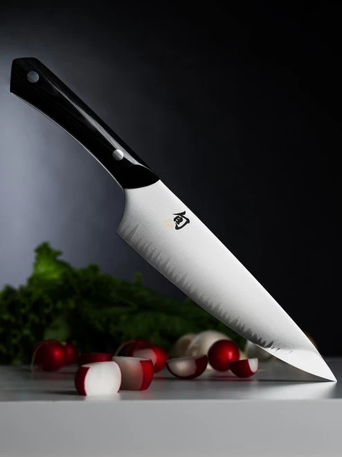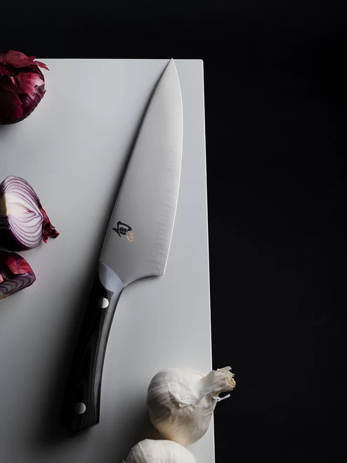 The Shun Narukami 8″ Chef’s Knife, also known as the “French” or “Cooks” knife, is the most important knife in the home or professional kitchen. Whether cutting, chopping, or slicing, no other knife is as versatile as the multi-purpose chef’s knife because it is a designed to perform a variety of common cutting tasks rather than excelling at any one. The upward curve of the knife’s edge allows for a rocking/chopping motion that allows for fast, fine mincing of small foods such as garlic, herbs, or ginger. The wide, flat blade is also excellent for pressing or smacking garlic cloves and popping them out of their papery husks. The chef knife’s extra width also makes chopping larger vegetables easy because it keeps your knuckles off the cutting board. In a pinch, it will even work for slicing and carving tasks due to its length and fine balance.