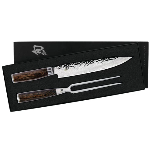 The Shun Premier 2-Piece Carving set includes our matched 9.5-in. Slicing Knife and Carving Fork in a boxed gift set. With these beautiful culinary tools, you will be able to achieve thin, even slices every time. The Shun Premier Carving Set will look simply stunning when used in presentation carving or will make a gorgeous addition to your holiday table. This set also makes a thoughtful gift.