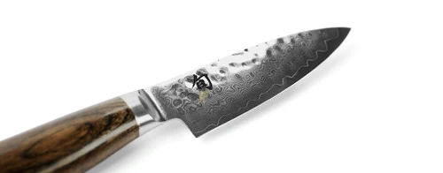 The Shun Premier Paring 4″ (TDM0700) Knife is part of the beautiful Shun Premier line, which calls to mind the hand-forged knives of ancient Japan. While each knife still takes at least 100 handcrafted steps to complete, the materials Shun uses are among the most advanced in the industry. Each blade has a cutting core of Shun’s proprietary VG-MAX “super steel” to take and hold a precision edge. The layered Damascus cladding supports the core and provides additional stain resistance. Near the edge of the blade, where the steels meet, an undulating line is formed—similar to the hamon formed when samurai swords are tempered using a traditional clay-baking technique. The hammered tsuchime finish acts like a series of hollow-ground cavities to reduce drag. The handles nestle comfortably in the hand, while the embossed end cap adds balance and beauty.