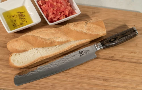 The Shun Premier Bread 9″ (TDM0705) knife features a serrated edge and is able to cut both soft and crusty breads without crushing or tearing. The serrations form dozens of small individual cutting edges that allow the knife to cut cleanly in either direction without the use of excessive pressure. Because only the tips of each of the serrations comes in contact with a cutting board or other surface, the points experience the majority of the wear while leaving the inner scalloped edges sharp for many years. In addition to slicing bread, the bread knife is also great for cutting watermelon and even tomatoes and other tough skinned but soft fleshed vegetables and fruits. Remember to use it in long strokes to best take advantage of its length. A kitchen essential, the beautiful walnut pakkawood handle makes this a stylish addition, too.