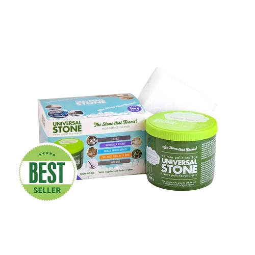 The Universal Stone is a multi-purpose, eco-friendly cleaning solution that keeps your home or workplace clean and healthy. The Universal Stone 900g size gives you enough green cleaning power for a year of regular use all around your home or business. It is a perfect addition to your cleaning kit for occasionally tackling the toughest cleaning jobs without using harsh and unhealthy chemical cleaners. Made from all-natural basic ingredients, including soap flakes, green soap, vegetable oils, glycerin, clay and natural lemon oils. Non-toxic, acid-free, fully biodegradable, phosphate-free, allergy- and asthma-tested, safe for everyone in your home or business.