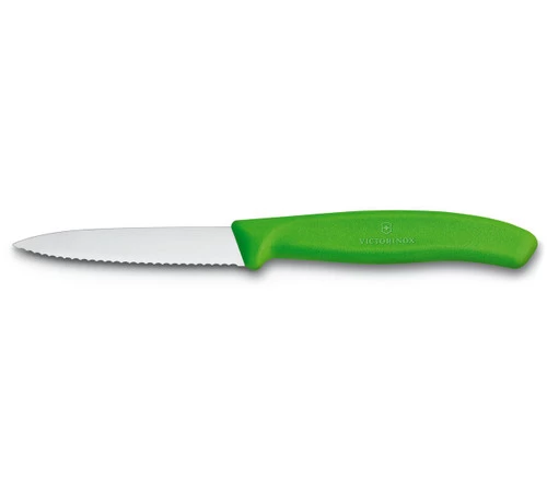 No matter what you’re about to prepare, the green Victorinox Swiss Classic Serrated Paring Knife will help you do it. Small, sharp and agile, this knife is delicate enough for delicacies and tough enough for the toughest meats. This Swiss-made paring knife has an ultrasharp wavy edge and ergonomic handle, perfect for cutting and preparing veggies, fruits, and other food. Keep it close at hand and cut, slice and carve your way through to a beautiful meal every time.