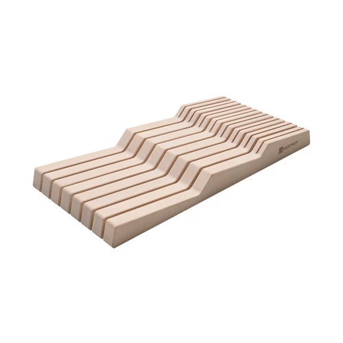 Your WÜSTHOF knives are worth protecting! This natural beech drawer insert offers space for up to 15 knives (7 larger knives of up to 23 cm and 8 smaller knives). The slots hold the knives firmly in position, preventing wear or damage caused by jarring or bumping. The strategic wave design of the insert allows you to easily pick up your stored knives and use them right away. Simply place your knives within the slots and the blades will rest tips hidden, protecting your hands and preventing dulling of the blades.Â