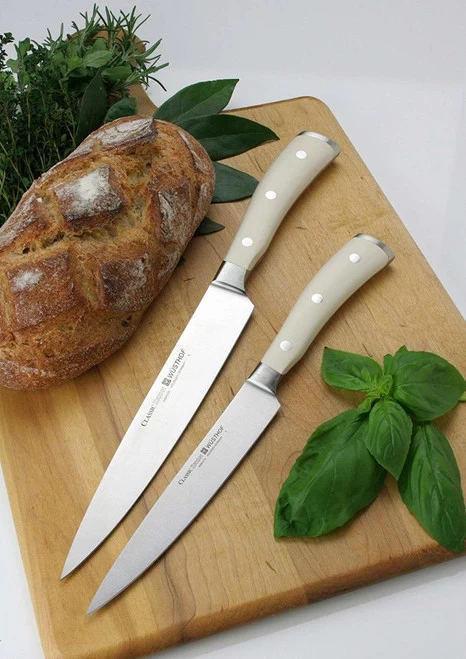 The Wüsthof Creme Ikon 9″ Bread Knife slices through bread or baguettes with minimal crumbs. The serrations along the edge help guide the blade through tough crust without compressing the soft inside.