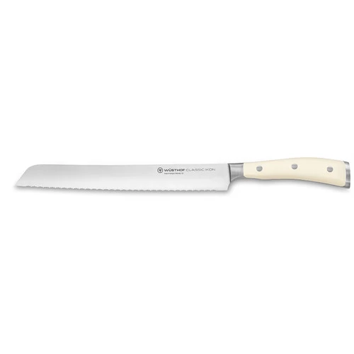 The Wusthof Classic Creme Ikon 9″ Double Serrated Bread Knife has double the number of serrations or a serration within the serration. The design of the double serrated bread knife glides through crusty breads with minimal crumbs without damaging the inside. This knife can also be used on delicate produce or even angel food cake. This style of edge is also ideal for left handed users as it does not pull like a traditional serration.