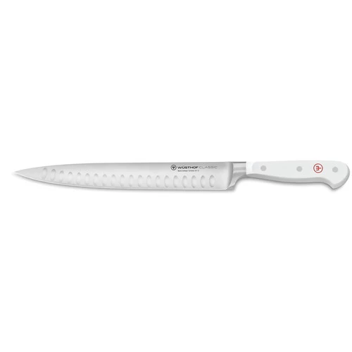 Precision forged from a single piece of high-carbon, stain-free steel, the Wüsthof Classic White 9″ Hollow Ground Edge Carving Knife features a long blade and is used to slice thin cuts of turkey, roast, ham, and other large cooked meats. A carving knife has a sharper edge than a chef’s knife, enabling it to cut thinner and more delicate slices. Its extra length allows it to make long and smooth slicing strokes—rather than having to saw back and forth rapidly – for professional-looking slices. The narrow blade helps with maneuverability, especially around the bone found in ham or prime rib. The carving knife can also be used to fillet salmon and other large fish and even easily slice larger fruits and vegetables.Â