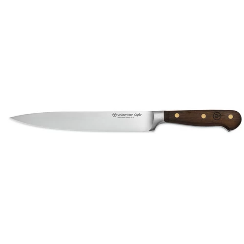 Precision-forged from a single piece of high-carbon, stain-free steel, the Wüsthof Crafter 9″ Carving Knife features a long, narrow blade and is used to precisely slice fine cuts of turkey, roast, ham, and other large cooked meats. A carving knife has a sharper edge than a chef’s knife, enabling it to cut thinner and more delicate slices. Its extra length allows it to make long and smooth slicing strokes—rather than having to saw back and forth rapidly – for professional-looking slices. The narrow blade helps with maneuverability, especially around the bone found in ham or prime rib. The carving knife can also be used to fillet salmon and other large fish and even easily slice larger fruits and vegetables. The long blade and pointed tip offer more control when guiding meat away from bone, but also helps to move food from serving dishes to dinner plates!Â