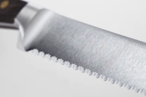 Precision-forged from high-carbon, stain-free steel, this bread knife features a precise double-serrated edge that makes a clear difference compared to other bread knives. This knife has serrations within serrations, meaning that it remains sharp for longer, requires less pressure, and is suitable for very precise, smooth cuts with minimal compression. Bread with a hard crust is not crushed, and bread with a soft crust is also sliced cleanly, without any tearing of the delicate surface. You can also use this knife to slice roasted meats or delicate-skinned fruits and vegetables with smooth and clean precision.Â