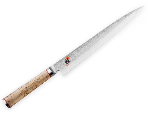 The SUJIHIKI knife from the MIYABI 5000MCD series is a Japanese slicing knife with a hand-forged blade made of 100 layers of different types of steel. The micro carbide MC63 powder steel blade core is embedded in layers of two different kinds of steel. The blades created in this way are extremely hard and easily recognised by their striking floral Damask pattern. The high-quality materials and their elaborate manufacture make the SUJIHIKI from ZWILLING a very durable knife. Both the 24 cm blade and the handle are characterised by an attractive appearance and as well as functionality. The ergonomic handle is made of the very best Masur birch, which blends perfectly with the high-quality steel blade. The SUJIHIKI is ideal for cutting meat and fish or for slicing a roast. Its scalpel-like sharpness is due to a unique honing technique. The blade is first sharpened by hand twice on rotating stones and is then polished on a leather wheel. This so-called Honbazuke honing gives the SUJIHIKI its extreme sharpness and allows the Damask pattern to emerge from the 100 layers of steel. Knives created in this way are characterised by their excellent cutting edge retention, corrosion resistance and ease of sharpening. Effortlessly slice a roast and other large cuts of meat with this knife.