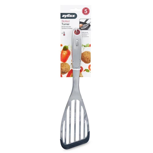 The Zyliss Slotted Turner was designed to serve your favorite large portions of meat, fish, casserole and everything else without dropping or breaking apart the actual food. The Slotted Turner is encased in premium quality stainless steel that heightens overall durability. The handle itself features an ergonomic soft touch grip. This ensures lasting comfort and maneuverability. The Zyliss Stainless Steel Slotted Turner also comes equipped with an integrated hanging hook that allows for easy and convenient storage.